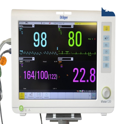 Dräger Vista 120: 15″ touchscreen patient monitor with up to 13 waveforms, 3/5-lead ECG, SpO₂, NIBP, RESP, dual TEMP. Optional IBP, etCO₂, cardiac output for ICU/OR/wards.