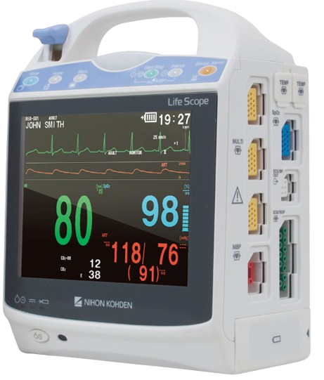 Nihon Kohden BSM-1700 (Life Scope PT) transport monitor: ECG, respiration, SpOâ‚‚, NIBP, COâ‚‚, temp. 5.7″ touchscreen, portable, seamless bedside integration & data upload. Refurbished & accessories available.